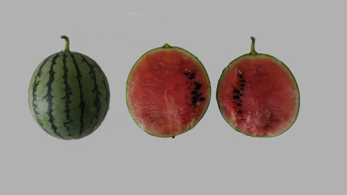 今日の収穫、小玉スイカ(9.5㎝X10㎝)。受粉から28日の三番果。ほぼ葉が枯れてしまったので収穫。