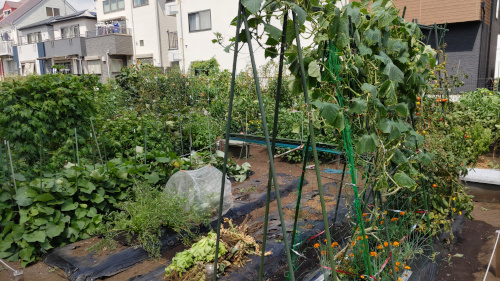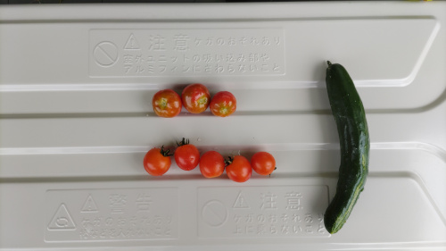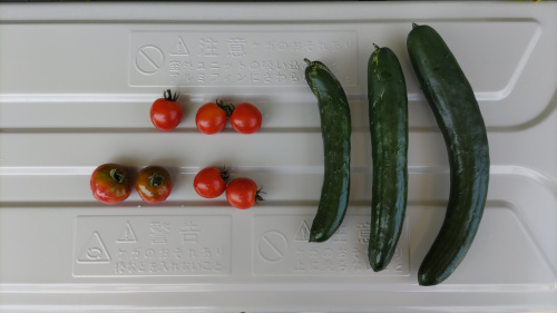 今日の収穫、枝豆、キュウリ、レタス、トマト。