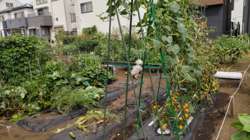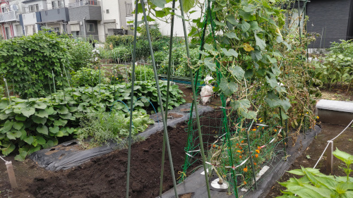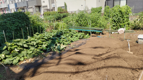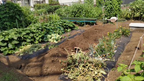 畝3の黒マルチを剥がし、掘り起こしを実施、同時にやぶからしの根茎を取り出す。