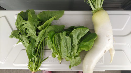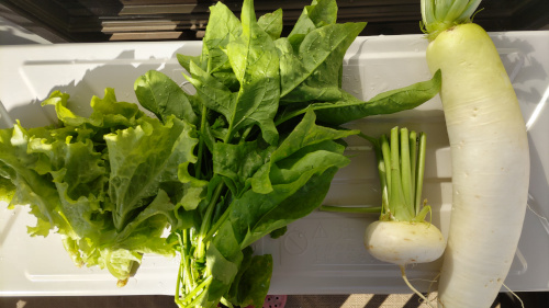 今日の収穫、ダイコン、カブ、ホウレンソウ、リーフレタス。