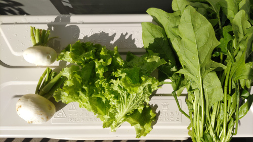 今日の収穫、カブ、ホウレンソウ、リーフレタス。