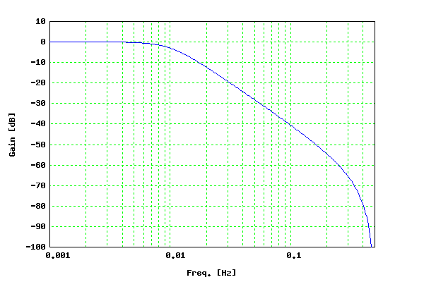 ---------------------- IIR Fiter --------------------------- filter type = Biquad band type = Low-pass pass band edge freq. = 0.01 Q facter = 0.70710678118655 base gain [dB] = 0 bits length = 32 ************** Filter Coefficients **************** 32(sb.bbbbbb) section 0: ----------------- c(0) = 9.44691710e-4 = 000f7a53 c(1) = 1.88938342e-3 = 001ef4a6 c(2) = 9.44691710e-4 = 000f7a53 d(1) = 1.91119707e+0 = 7a510d81 d(2) = -9.14975835e-1 = c5710932